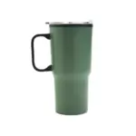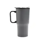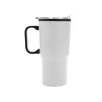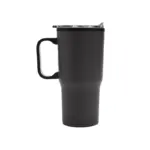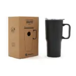 Mug térmico con mango, realizado en acero inoxidable en su exterior, y polipropileno de color negro en su interior. Cuenta con tapa transparente cristal clear con cierre. Incluye base antideslizante. Producto libre de BPA. Interior realizado en plástico. para el contacto con alimentos.