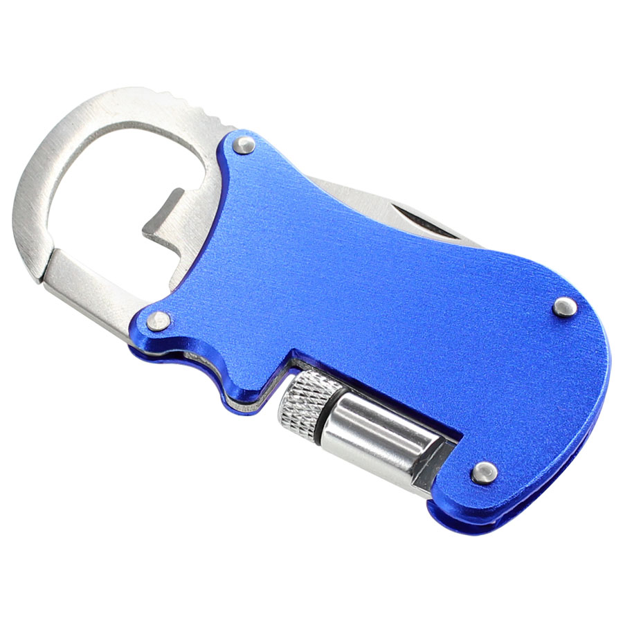 Multiherramienta metálica 4-en-1 con Linterna LED, Navaja, Destapador y Mosquetón.