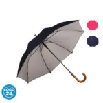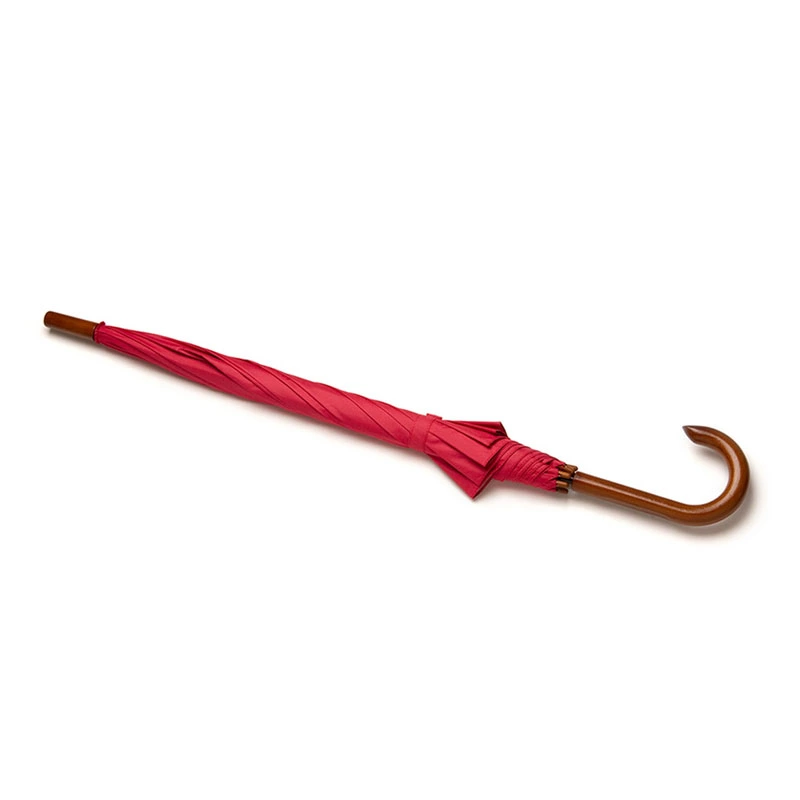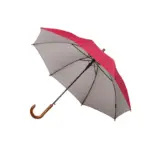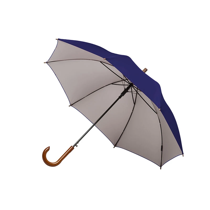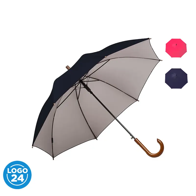 Paraguas street de 8 gajos con mango curvo de madera y estructura metálica negra. Con sistema de apertura automática. Tela de interior silver combinada con exterior en colores. Material: Pongee con interior silver. Medidas: 80 cm x Diámetro 105 cm.
