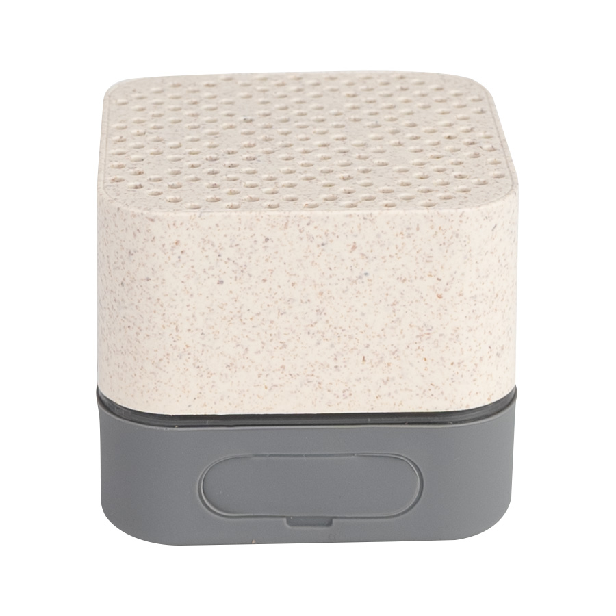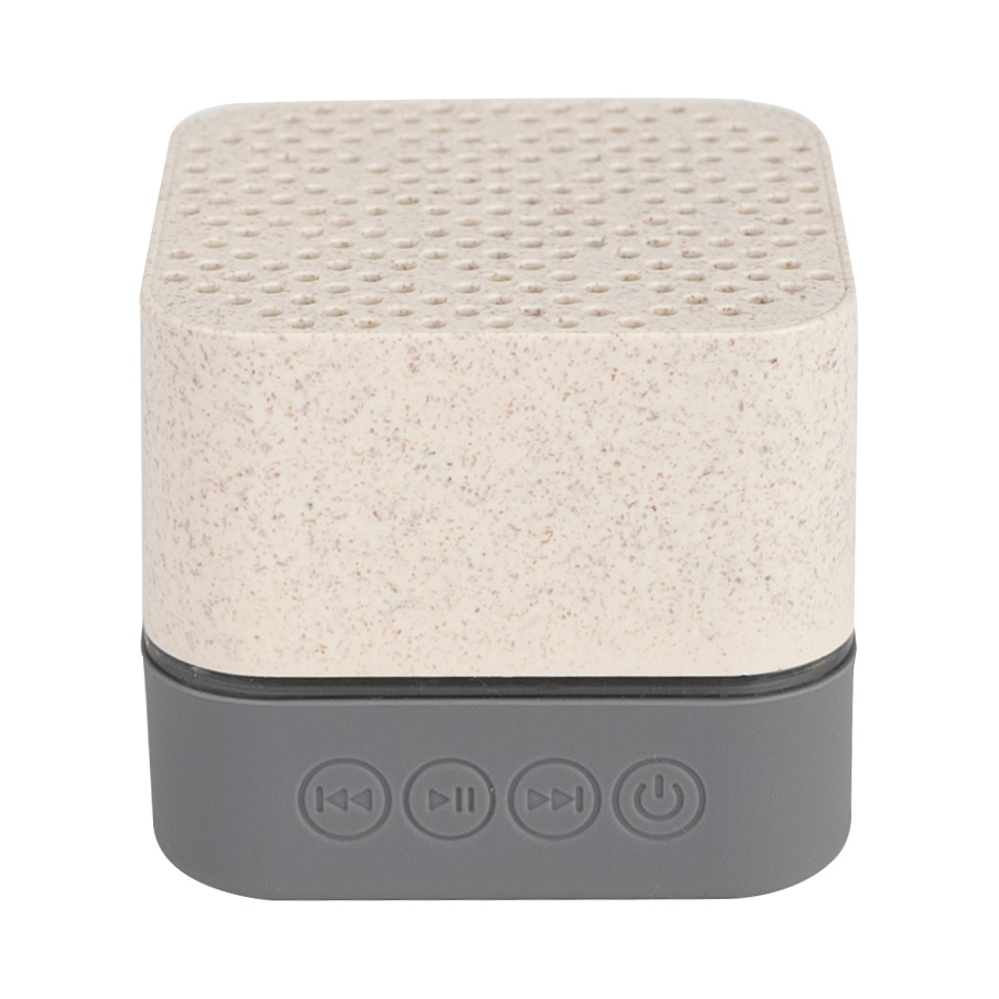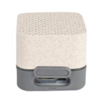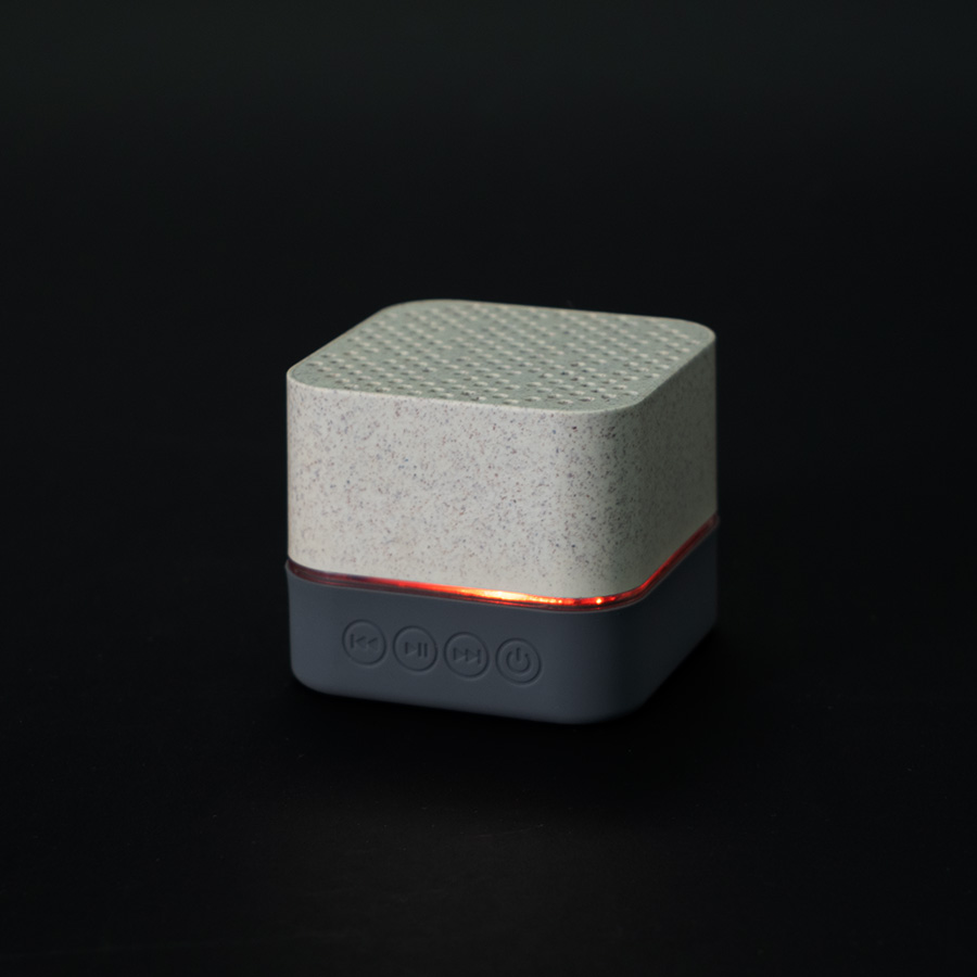 Parlante altavoz de caña de trigo (wheat straw) «LIFE» con juego de luces LED y sección inferior de silicona gris con funciones.