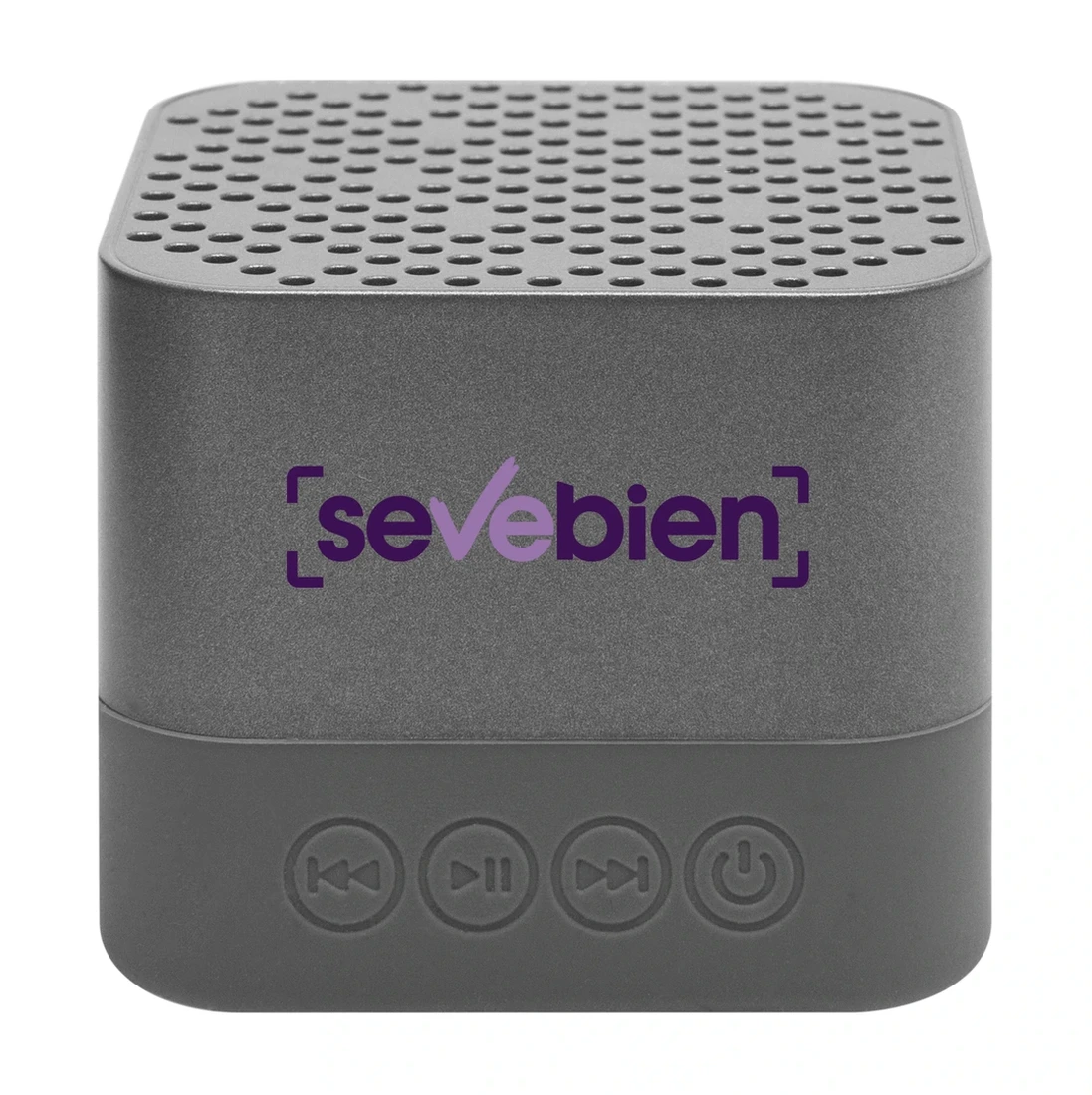 5,8 x 5,8 x 4,8 cm. Plástico. Parlante/bocina bluetooth cuadrado, en la parte inferior goma antideslizante. Botones de Power: on/off, botón de avance y retroceso que presionandolo durante unos segundos aumenta o disminuye el volumen y presionando solo una vez avanza o retrocede hacia otra canción, botón de play/pausa, luz led indicadora de encendido y entrada USB. Presentación en caja de regalo.