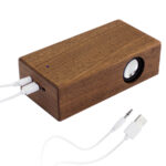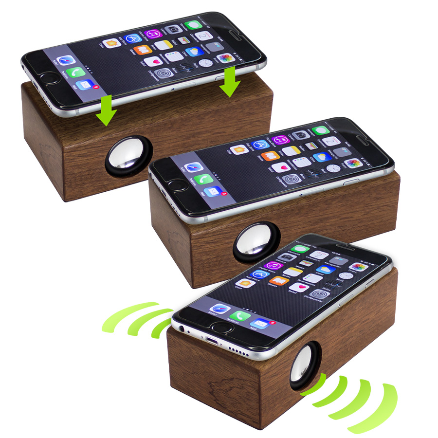 Parlante amplificador de sonido por Inducción, tamaño grande, de madera barnizada de Nogal. Ahora con mayor potencia y mejor calidad de sonido!! No necesita Bluetooth, Wi-Fi o conexión a cable. Amplifica el sonido una vez que se posa el celular sobre él, con un efecto de caja de resonancia. Compatible con cualquier modelo de teléfono celular. Contiene batería de ion-litio recargable incorporada. Incluye cable de sonido y cargador USB/Micro-USB.