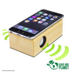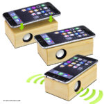 Parlante amplificador de sonido por Inducción, de madera de Bamboo. No necesita Bluetooth, Wi-Fi o conexión a cable. Amplifica el sonido una vez que se posa el celular sobre él, con un efecto de caja de resonancia. Compatible con cualquier modelo de teléfono celular. Contiene batería de ion-litio recargable incorporada. Incluye cable 2 en 1 Auxiliar/Mini-USB y cargador USB.