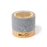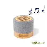 Parlante portátil fabricado en bambú y RPET. Tiene tecnología Bluetooth 5.0 y una batería de 300 mAh. Ofrece de 2 a 4 horas de reproducción con una carga de 2.5 horas. El parlante viene dentro de una caja de cartón junto a su manual de instrucciones y cable cargador. Dimensiones: 5,4 x 6,05 cm. Reuseme. Incluye Gift Box confeccionada en cartulina Kraft.