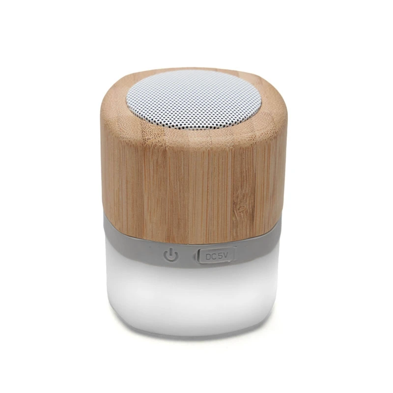 Parlante portátil con tecnología Bluetooth. Realizado en combinación de ABS con Silicona y bamboo, con iluminación en la base.