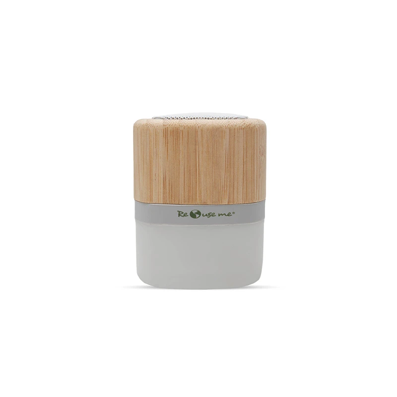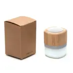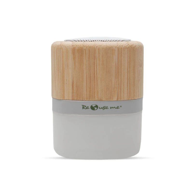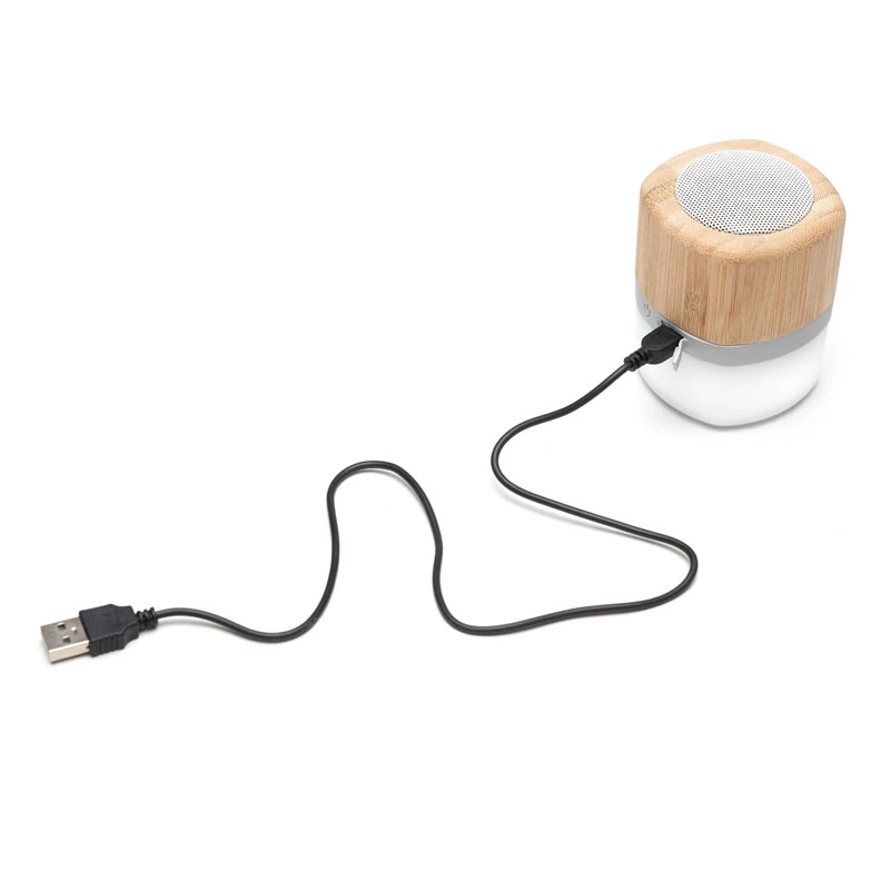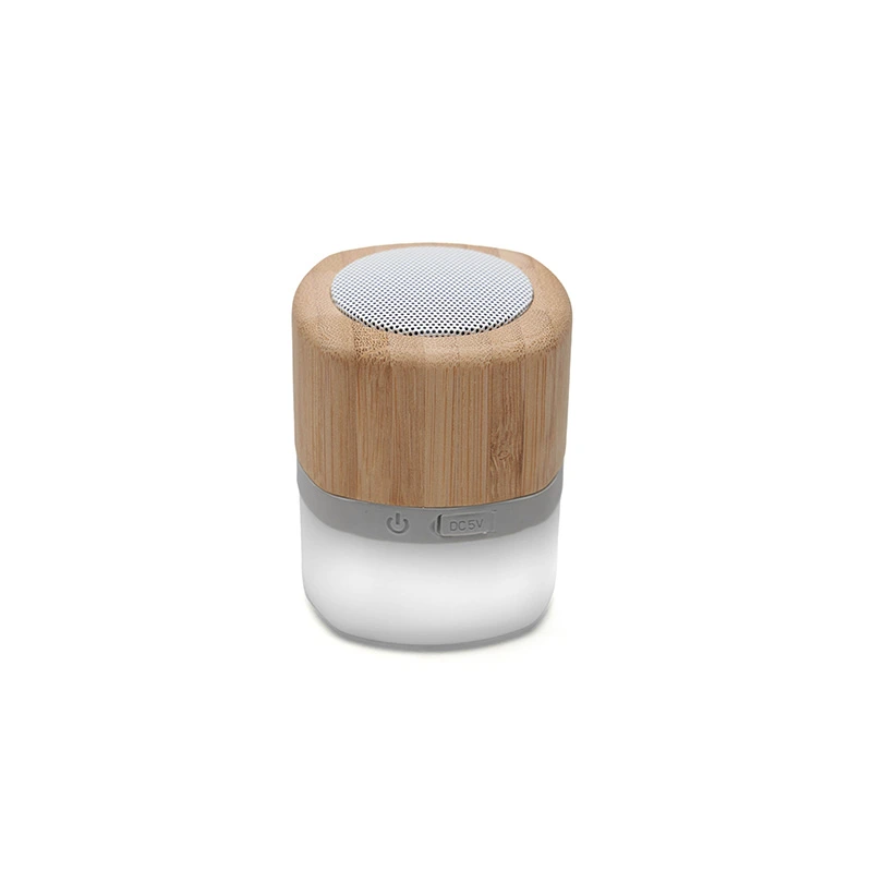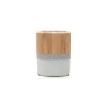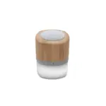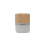 Parlante portátil con tecnología Bluetooth. Realizado en combinación de ABS con Silicona y bamboo, con iluminación en la base.