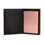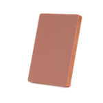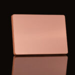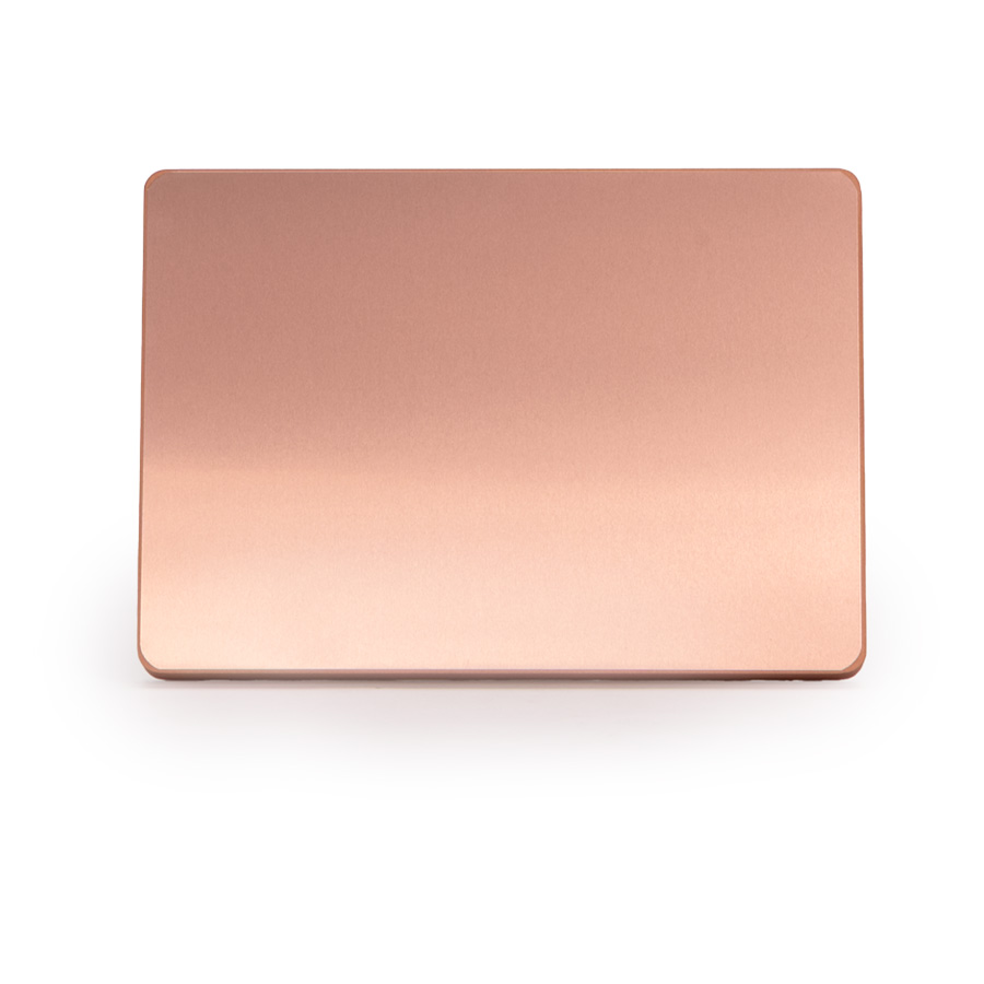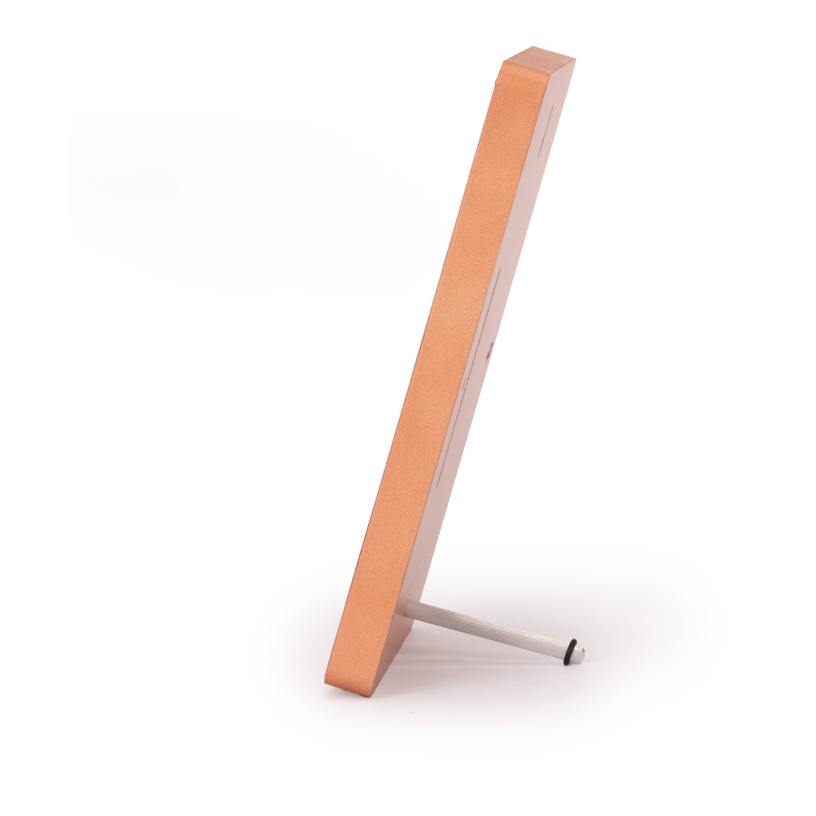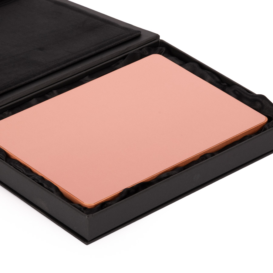 Placa metálica color cobre, modelo «BLOCK», montada sobre base rectangular de madera enchapada con esquinas redondeadas. En su parte posterior, incluye orificios y soporte metálico para exhibición vertical u horizontal. Presentación en caja de cartón forrado negro con cierre imantado, interior acolchado de espuma y tela poliéster satinado negro, con troquel. OJO: la placa metálica viene con film plástico removible, para protección de la misma.