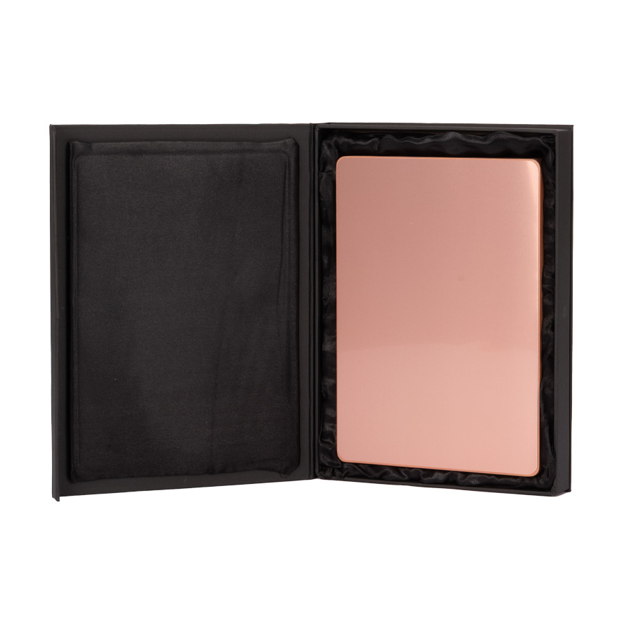 •Presentación: Caja de cartón forrado negro con cierre imantado, interior acolchado de espuma y tela poliéster satinado negro, con troquel.