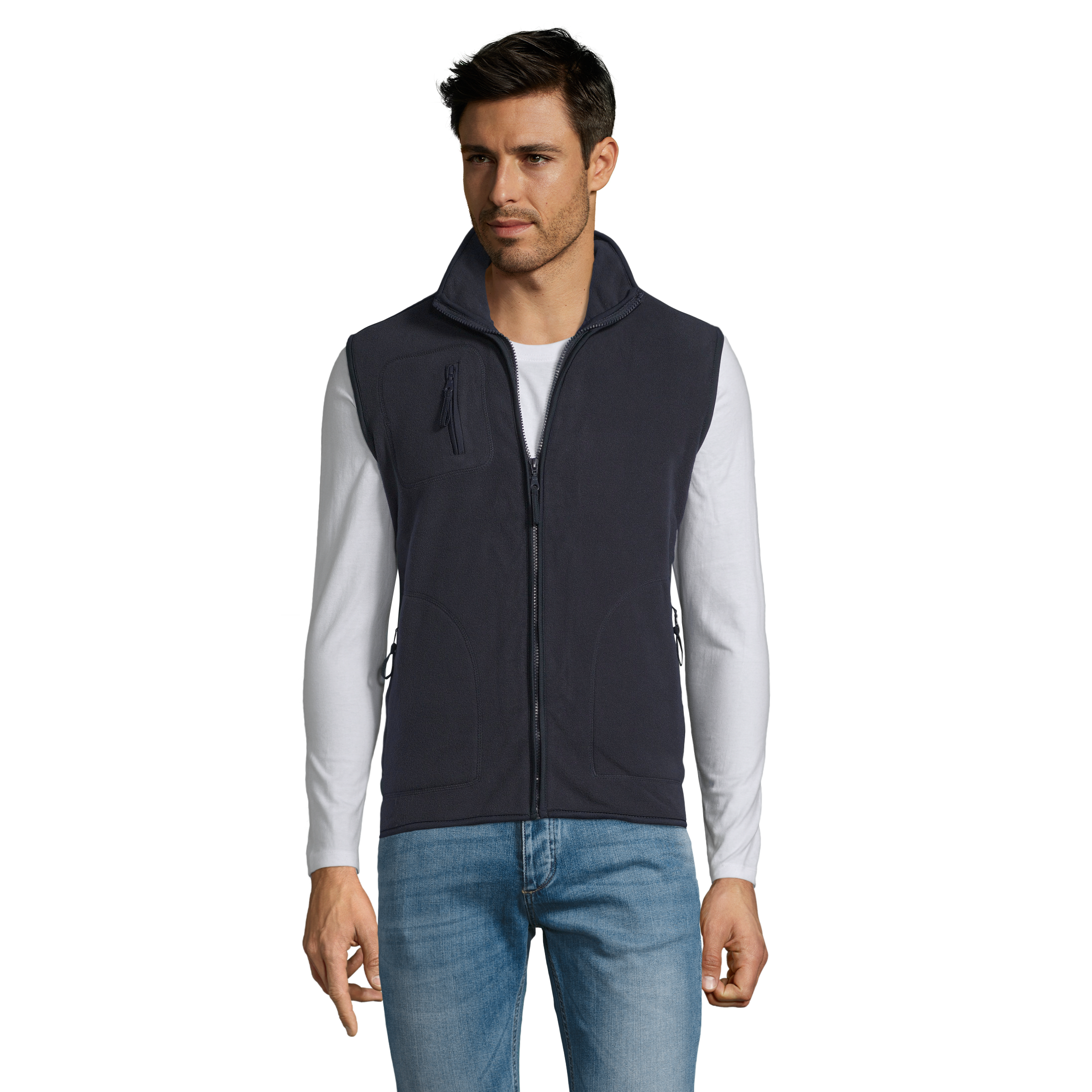 Chaleco de polar unisex confeccionado en polar 320g 100% poliéster y con tratamiento antipilling. Cuenta con cuello alto con tapa costura y tres bolsillos con cierre (dos laterales inferiores y uno lateral derecho superior).