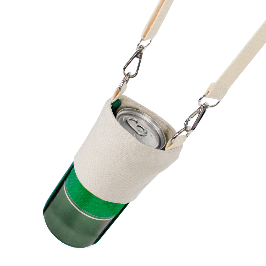 Porta-Lata o vaso de café colgante, en tela Canvas de 10oz color natural. Contiene soporte de color verde y lanyard colgante removible de 84 cm. de largo.
