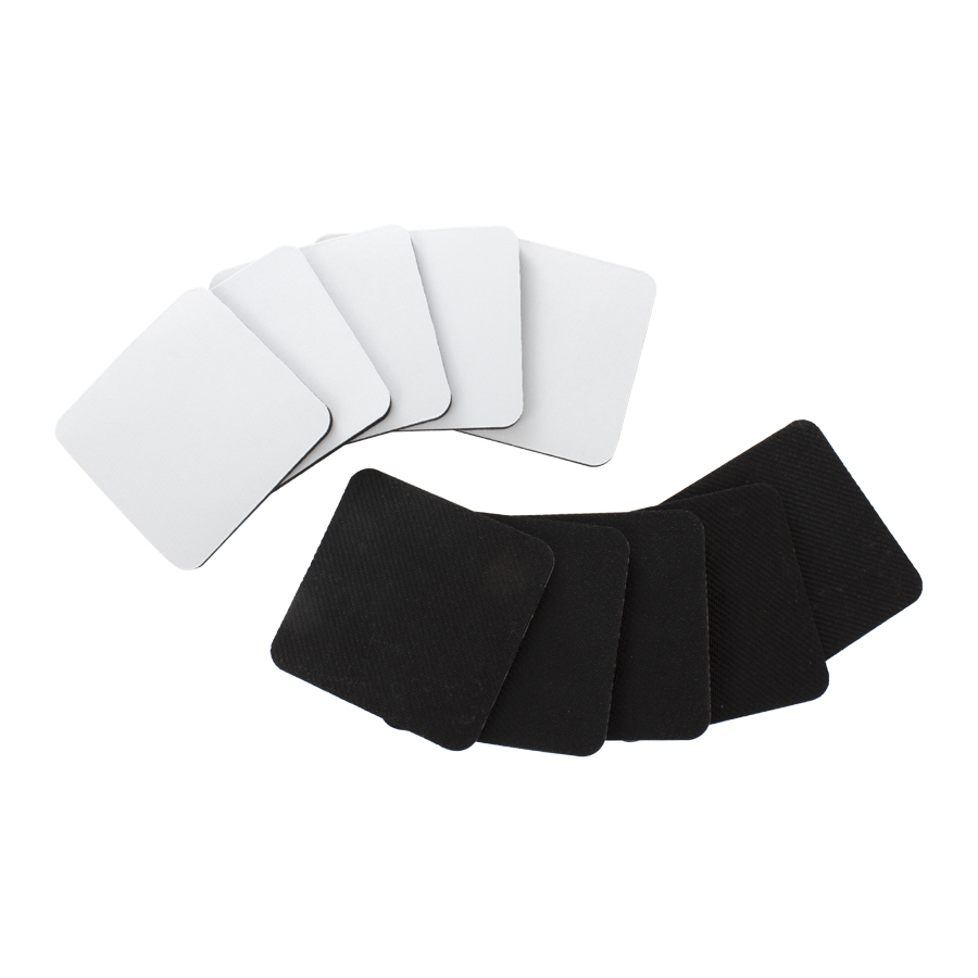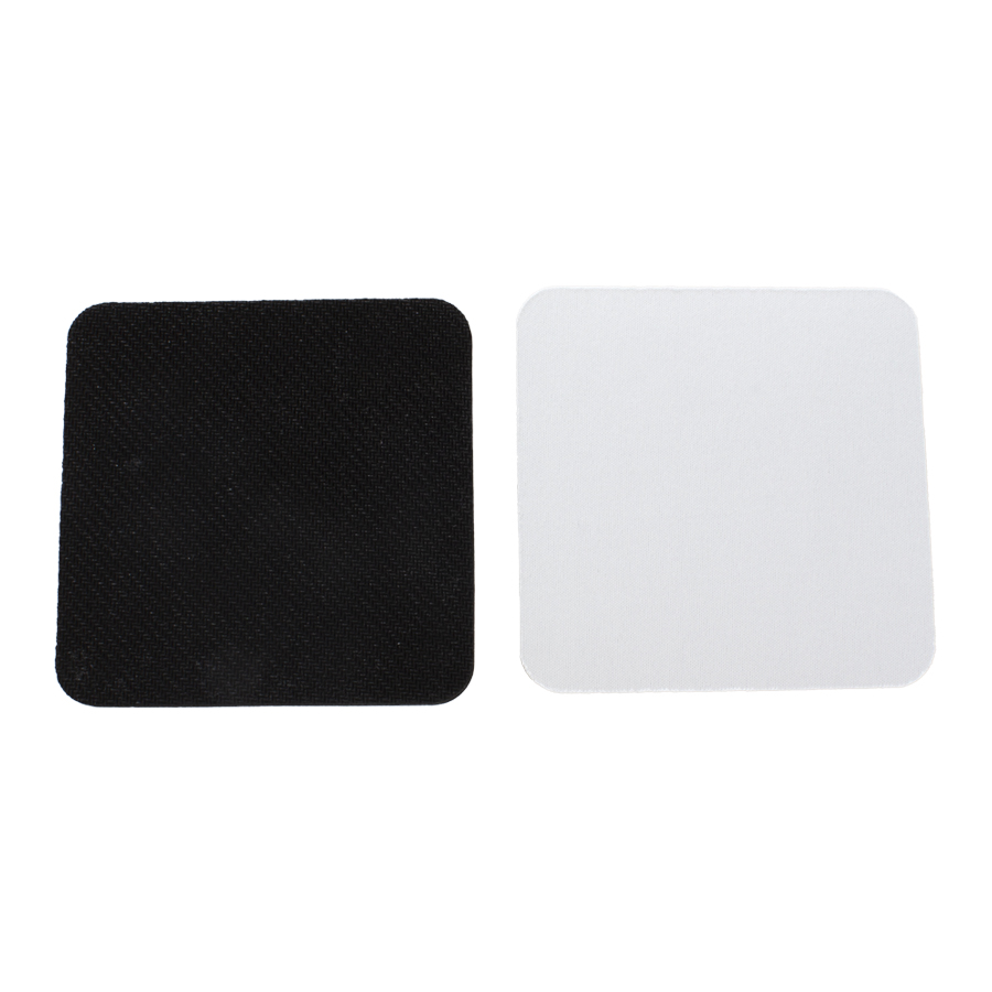 Posavaso cuadrado de 10x10cm. y 5mm de espesor, esquinas redondeadas, con base de silicona negra y cubierta de tela poliéster blanco para Sublimación.