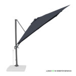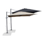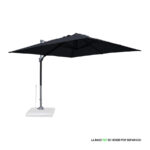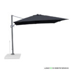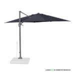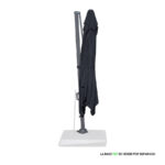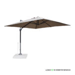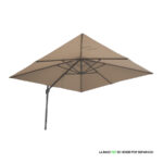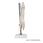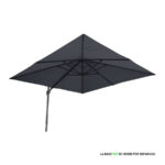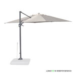 Quitasol lateral cuadrado de 3x3m, con 4 cascos de lona Poliéster UV impermeable de 200g. Contiene asta de Aluminio de 80x50mm x 2.47m de altura y 8 varas de acero. Sistema de apertura manual con regulación de altura y ángulo para sombra. Sistema manual de rotación 360°.