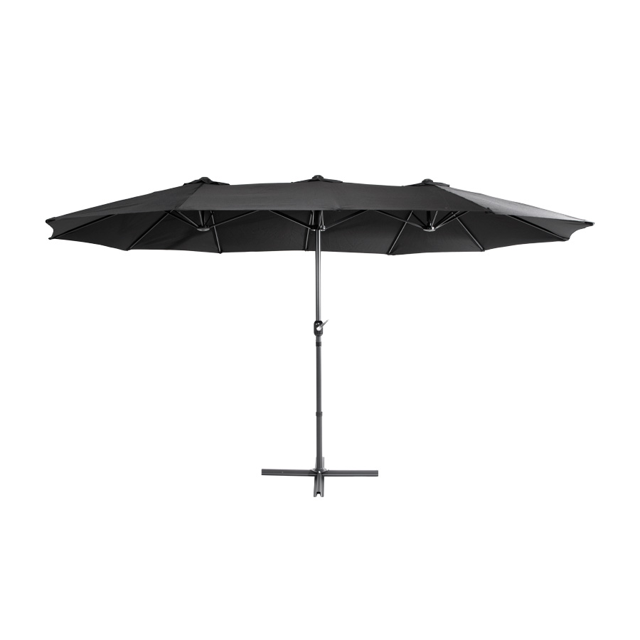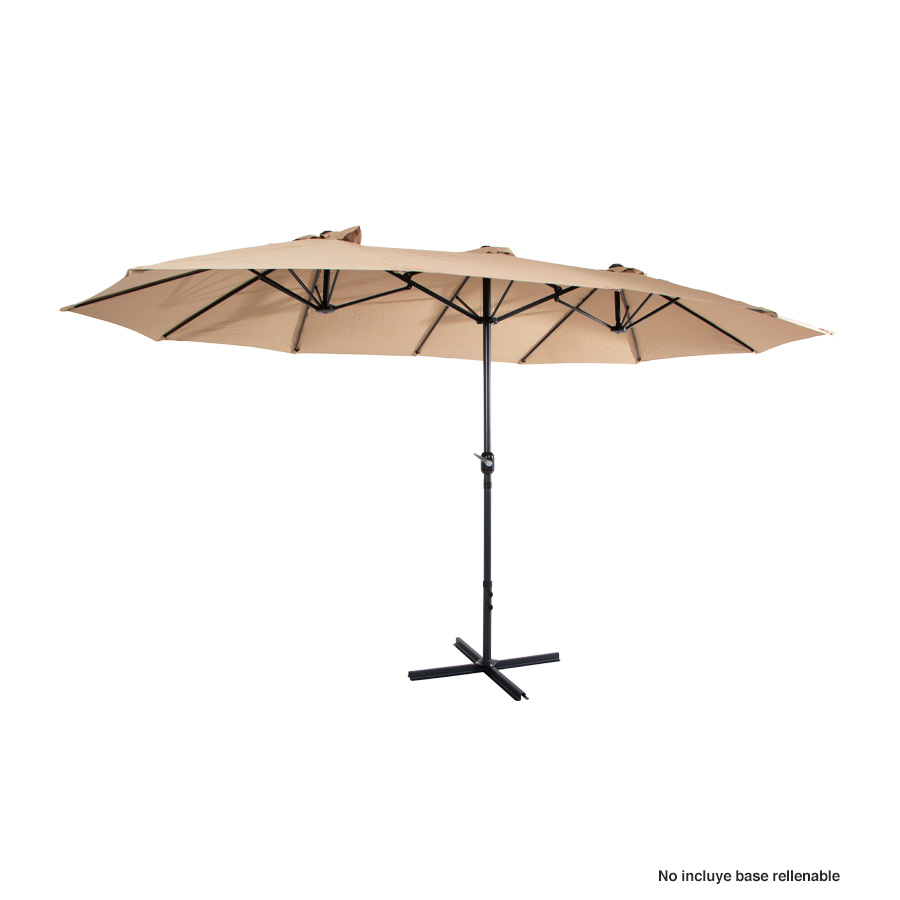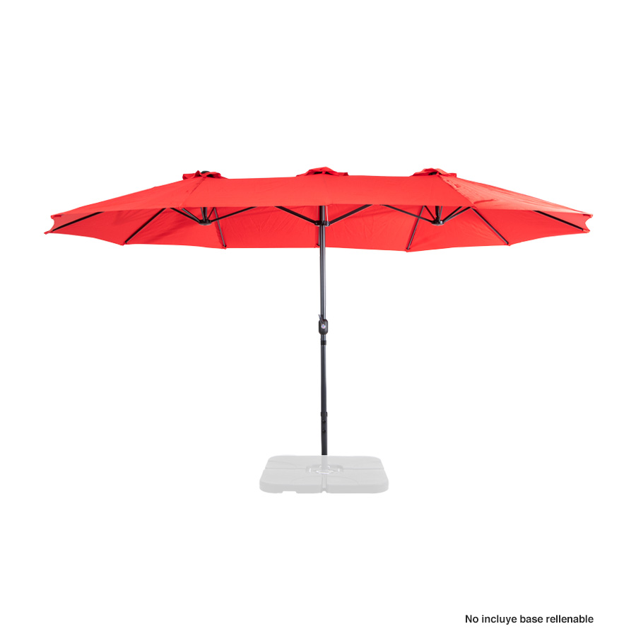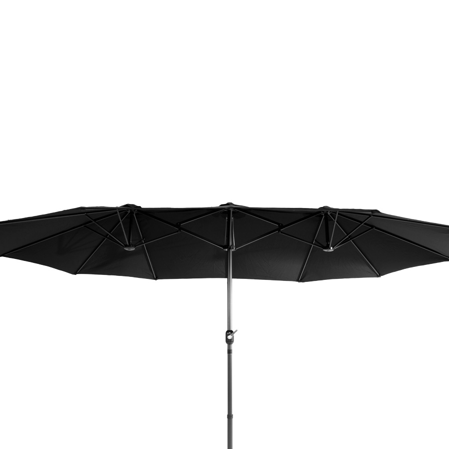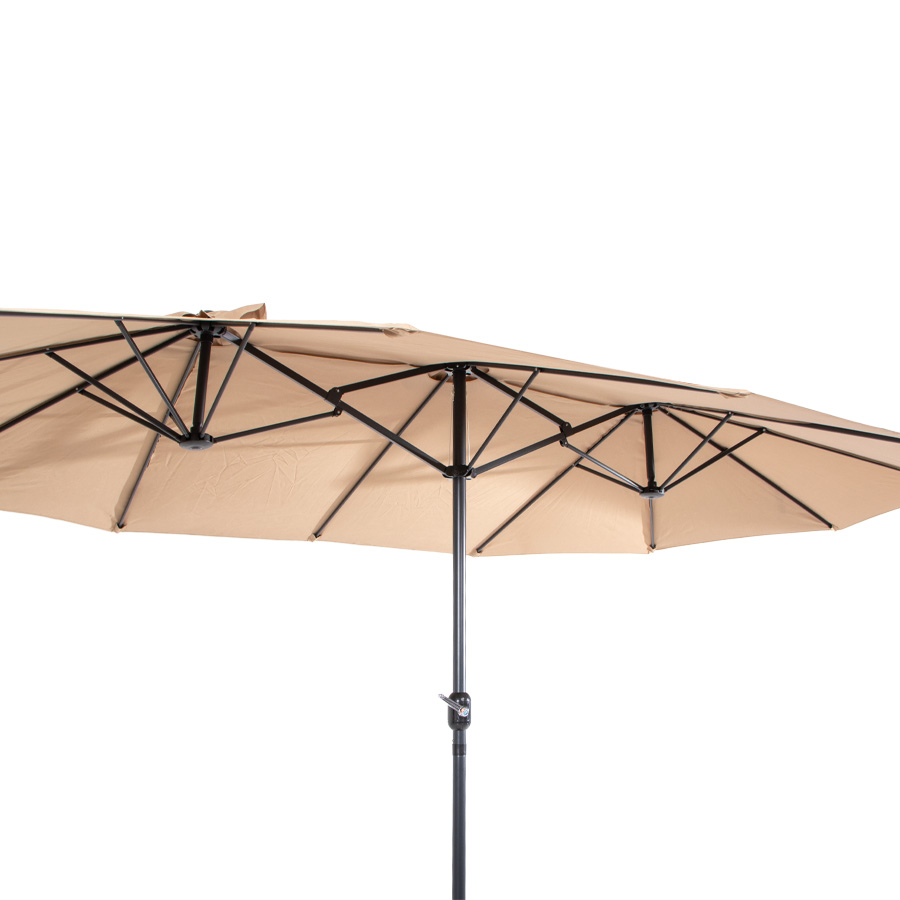 Quitasol ovalado doble de 4.55 x 2.7 m, modelo «Twins», con 12 cascos de lona Poliéster UV impermeable de 180g. Contiene varas reforzadas de Acero recubierto de 12 x 18mm, asta de Acero recubierto de 48mm, sistema de apertura automático con manivela.