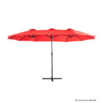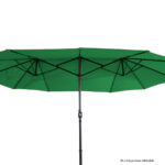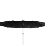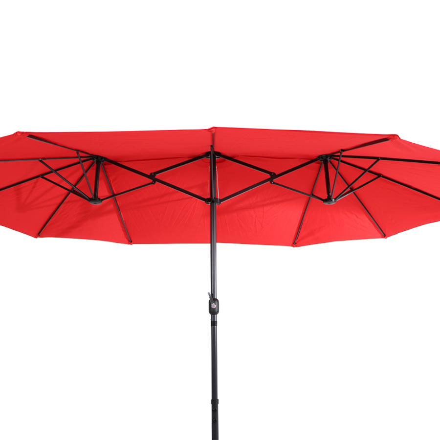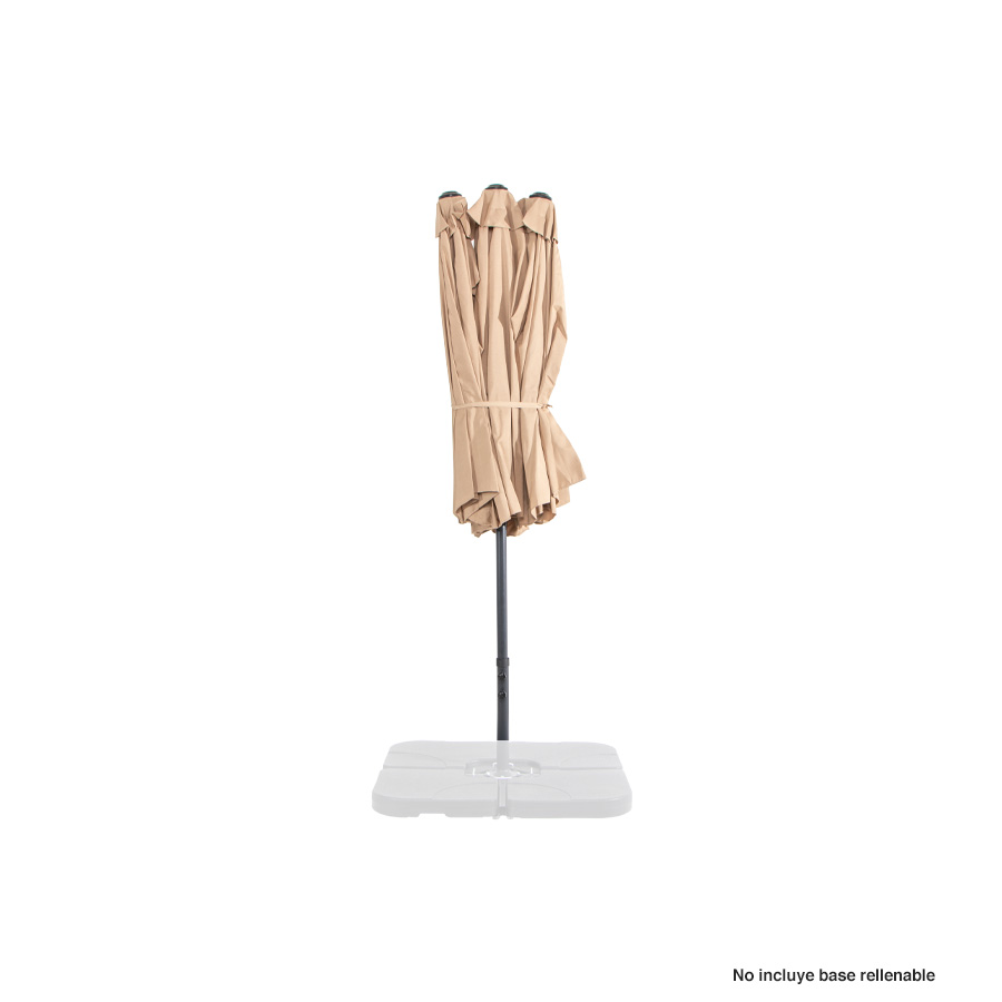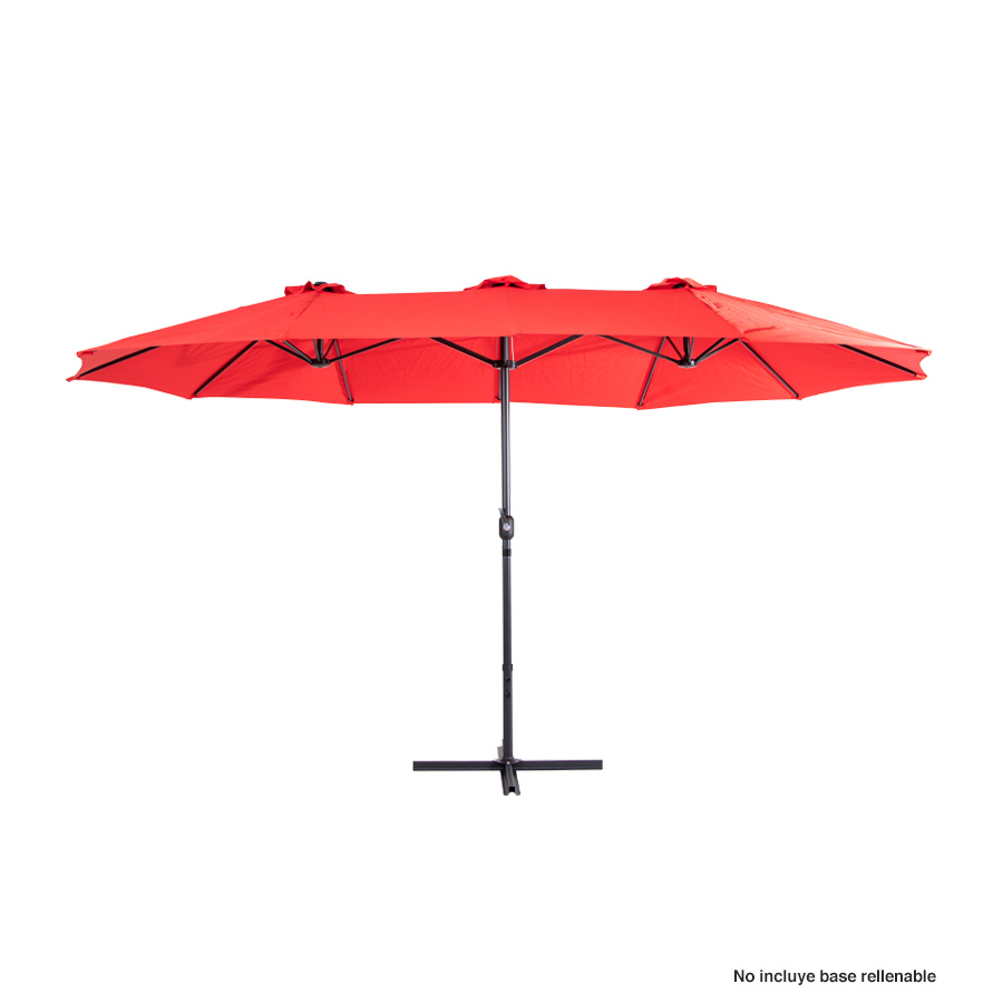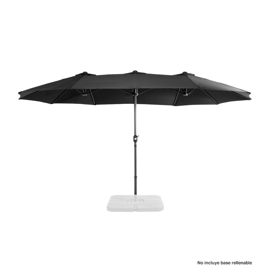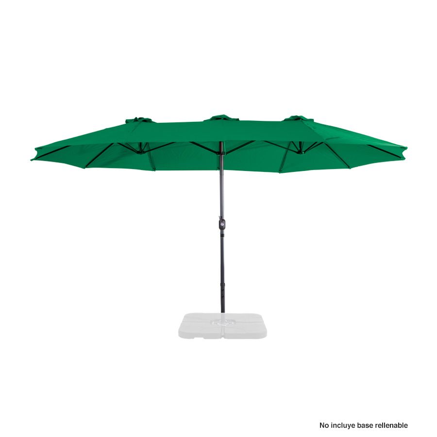 Quitasol ovalado doble de 4.55 x 2.7 m, modelo «Twins», con 12 cascos de lona Poliéster UV impermeable de 180g. Contiene varas reforzadas de Acero recubierto de 12 x 18mm, asta de Acero recubierto de 48mm, sistema de apertura automático con manivela.