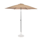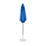 Quitasol redondo modelo «RAVELLO» de 2.5m de diámetro, con 6 cascos de lona Poliéster UV impermeable de 160g. Estructura asta central de 3.2cm diámetro x 1.6mm de espesor + 6 varas de 6x10mm, ambos Acero con pintura electrostática color negro, altura 2.3m, con sencillo sistema de apertura manual. Incluye codo giratorio de 45°. NO INCLUYE BASE.