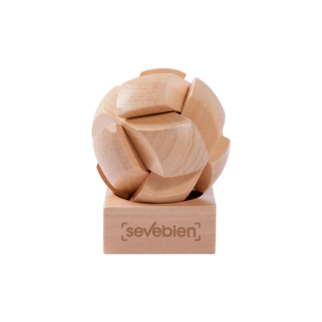 Ø 7,2 cm. Base 5,3 x 5,3 x 2,4 cm. Madera. Rompecabezas en forma de pelota. Presentación en caja de regalo.