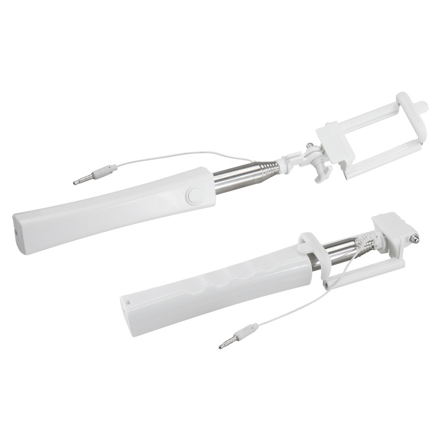 Palo extensible para Selfie «Monopod». Largo alcance de 150cm. con tu brazo extendido. Extensión total selfie-stick desplegado: 95cm. Cerrado: 30cm. Mango plástico blanco con buen área de impresión. Contiene cable de conexión y botón de disparo. No requiere aplicaciones extras para disparo.