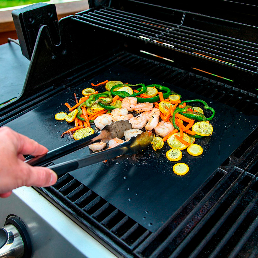 Set de 2 alfombrillas de teflón y fibra de vidrio, para cocinar mariscos, carnes, pescados o verduras sobre la parrilla . Resiste temperaturas hasta 260°C. Apilable, liviana, lavable y reutilizable.