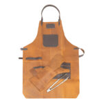 Un regalo fuera de serie. Deluxe set de Asador, contiene Pechera de Asador BBQ en cuero curtido, envejecido y suavizado 100% genuino color café cognac, con cintas y porta-accesorios de Cuero 100% genuino color café oscuro. Remaches de acero envejecido y 2 bolsillos delanteros de 22 x 18 cm. y 18 x 14 cm. Rectángulo para logo de 10 x 5 cm. Contiene además largo mitón de Asador BBQ en cuero curtido, envejecido y suavisado 100% genuino color café cognac y tenazas de Acero inoxidable. Presentación en elegante caja de regalo de cartón negro con ventana de mica transparente y gráfica a todo color con descripción de los elementos del set.