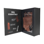 Un regalo fuera de serie. Deluxe set de Asador, contiene Pechera de Asador BBQ en Cuero tostado 100% genuino color café cognac, con cintas y porta-accesorios de Cuero 100% genuino color café oscuro. Remaches de acero envejecido y bolsillo delantero de 20.5 x 23 cm. Cuadrado para logo de 8 x 8 cm. Contiene además largo mitón de Asador BBQ en Cuero engamuzado 100% genuino color café cognac y tenazas de Acero inoxidable. Presentación en elegante caja de regalo de cartón negro con ventana de mica transparente y gráfica a todo color con descripción de los elementos del set.