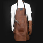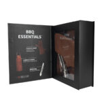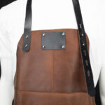 Un regalo fuera de serie. Deluxe set de Asador, contiene Pechera de Asador BBQ en Cuero engamuzado 100% genuino color café cognac, con cintas y rectángulo de 8 x 5 cm. de Cuero 100% genuino color negro. Argolla, destapador y remaches de acero envejecido y bolsillo delantero de 20 x 21 cm. Contiene además largo mitón de Asador BBQ en Cuero engamuzado 100% genuino color café cognac y tenazas de Acero inoxidable. Presentación en elegante caja de regalo de cartón negro con ventana de mica transparente y gráfica a todo color con descripción de los elementos del set.