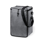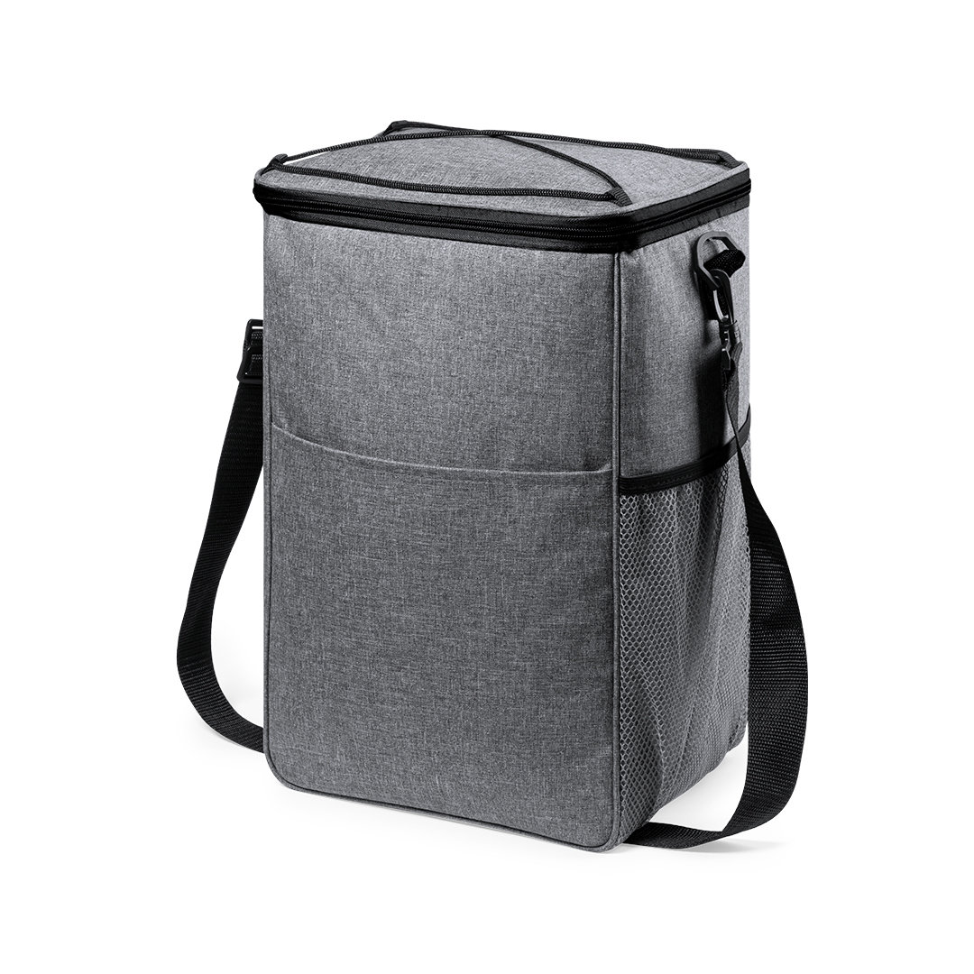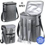 Set de barbacoa con 3 accesorios. Incluye: Bolsa de transporte/nevera fabricada en resistente poliéster RPET 300D, elaborado a partir de plástico reciclado, para así fomentar la reutilización de residuos plásticos y ayudar a la sostenibilidad del planeta. Con cinta para hombro ajustable de cierre de mosquetón e interior isotermo en PEVA, para conservar la temperatura de los alimentos. Distintivo RPET en etiqueta etiqueta exterior.Paleta, pinzas y trinchador metálicos, con mangos en color negro. 3 Accesorios