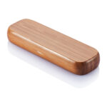 Set Bolígrafo Ejecutivo de Madera de Bamboo, con terminales plateados. Refill plástico parker type. Escritura negra. Incluye elegante Estuche de Bamboo sólido. Presentación individual en caja de cartulina reciclada color natural.