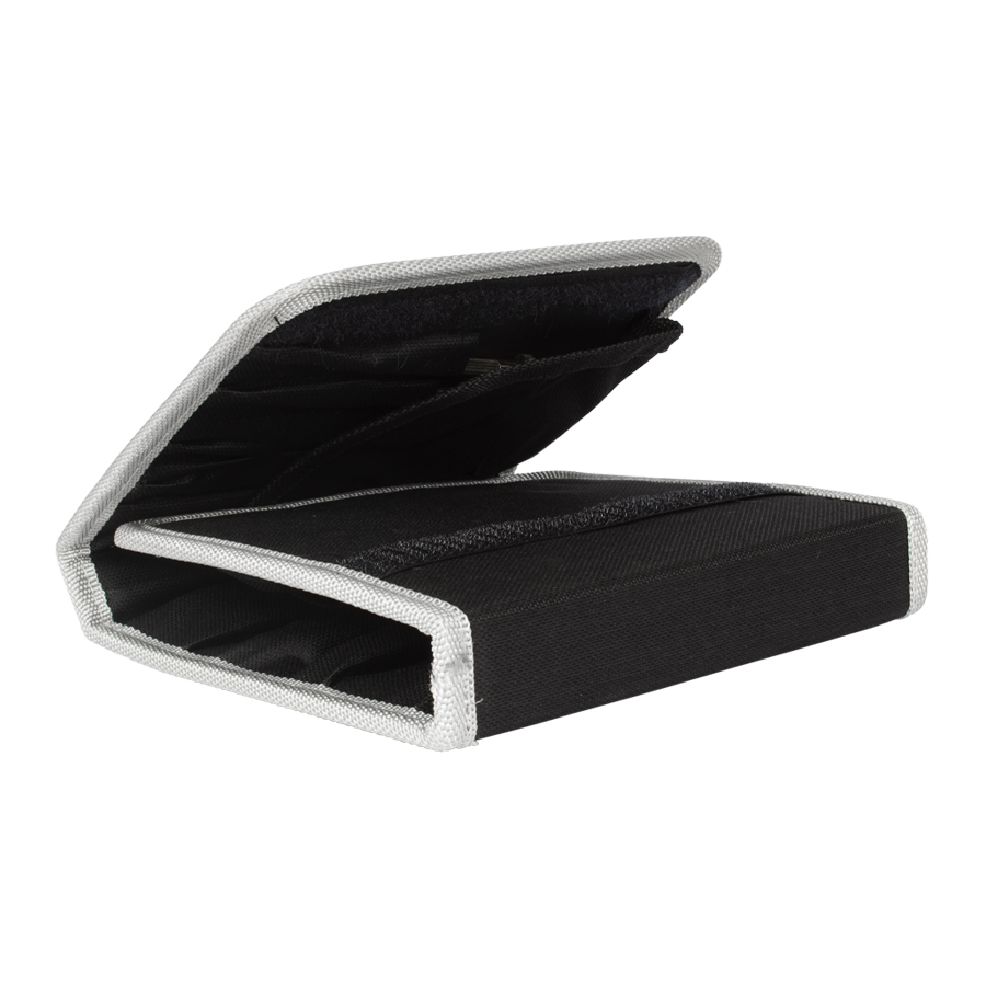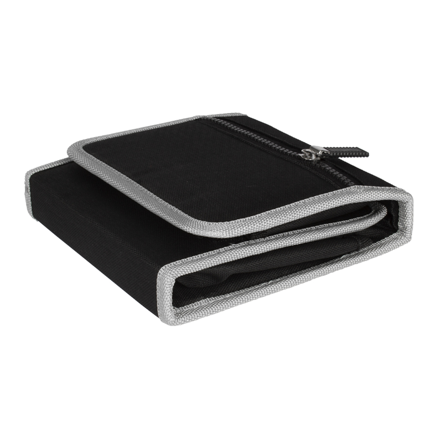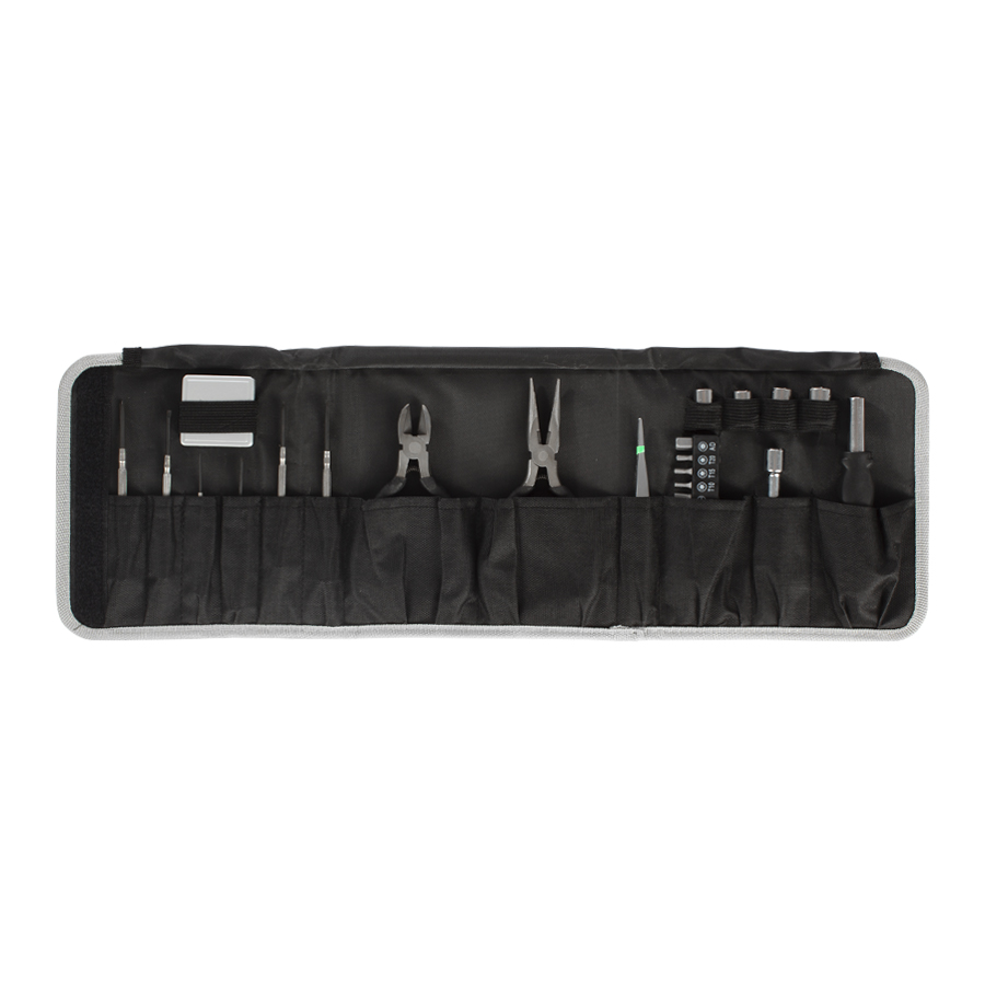 Set de 26 prácticas herramientas en Estuche plegable de tela raquelada negra.