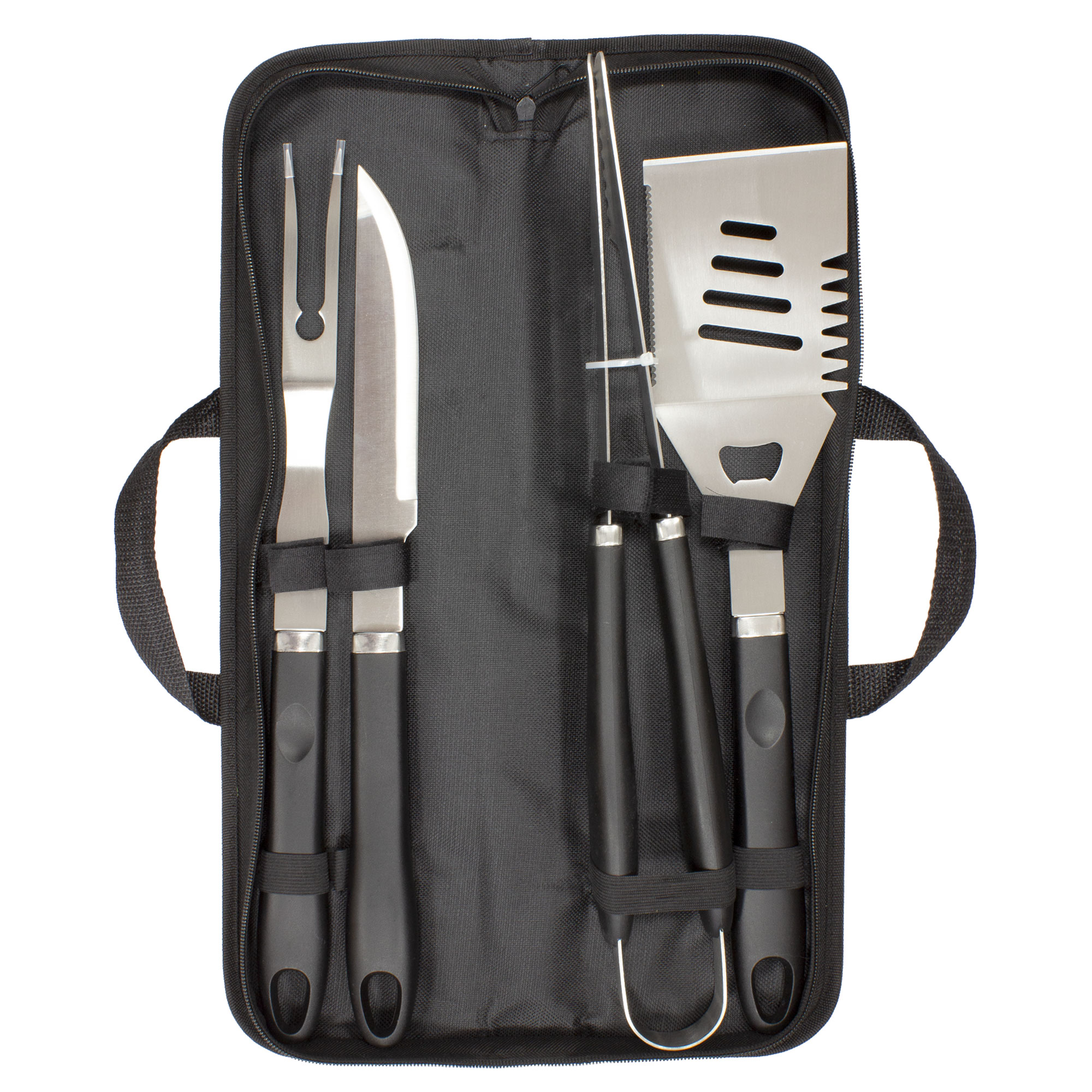 48 x 12,2 x 5,5 cm (estuche cerrado). Acero inoxidable 420. Set de 4 utensilios: tenedor y cuchillo de 41 cm, pinza de 44,5 cm y espátula de 40 cm de largo, todos con mango plástico en color negro. Estuche de nylon 600 D color negro con cierre. Calidad Premium.