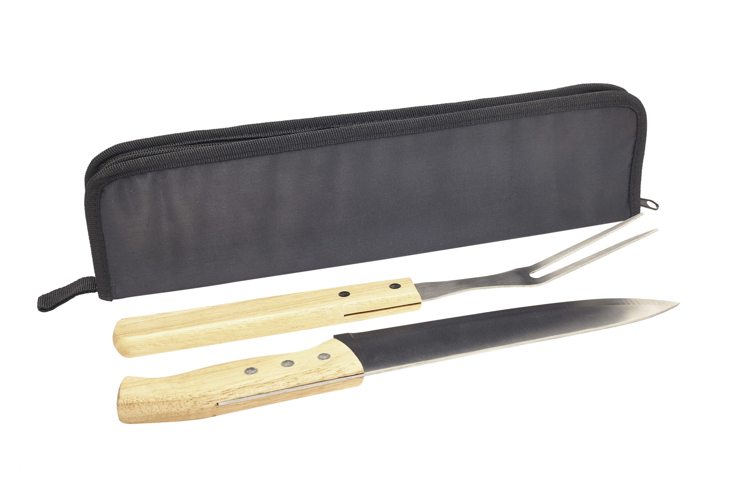 9,5 x 35,5 (estuche cerrado) 20 x 35,5 (estuche abierto). Tenedor: 33 cm y cuchillo: 32,5 cm. Acero inoxidable y madera + Poliéster. Set de cuchillo y tenedor con mango de madera. Estuche de poliéster con cierre. Presentación en caja de regalo.