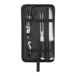 36 x 9,5 x 3 cm. Acero inoxidable y polipropileno + Nylon. Set de asado en estuche con cierre. Contiene: tenedor , asador y cuchilla con mango color negro. Trae tijera y destapador de vino.(Las medidas volcadas son las del estuche).