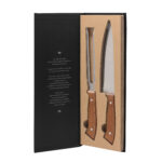 37,8 x 13 x 2,8 cm (caja cerrada). Acero inoxidable 420 y Madera de Acacia. Set de 2 utensilios: Cuchillo chef de 33,5 cm y 175 g. Tenedor de 31,3 cm y 125 g., ambos con mango de madera. Presentación en caja de regalo estilo libro.