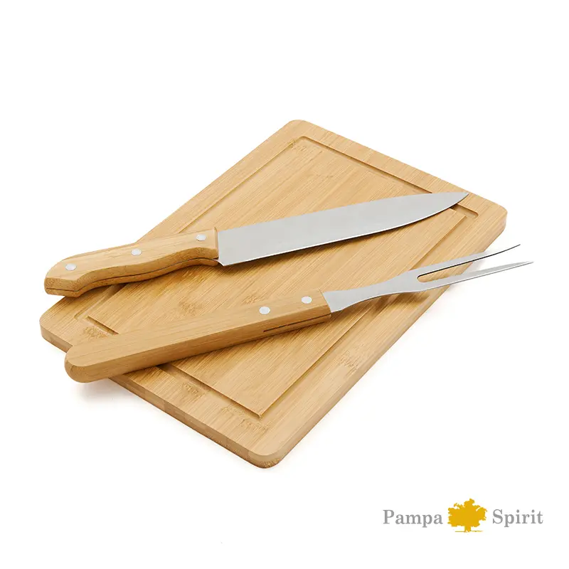 El set de asado Roti contiene: tenedor y cuchillo de 33 cm, ambos con mango de madera y, tabla de bamboo de 30 x 20 x 1,2 cm. Este set incluye todo lo que necesitas, ideal para los amantes del asado. Pampa Spirit