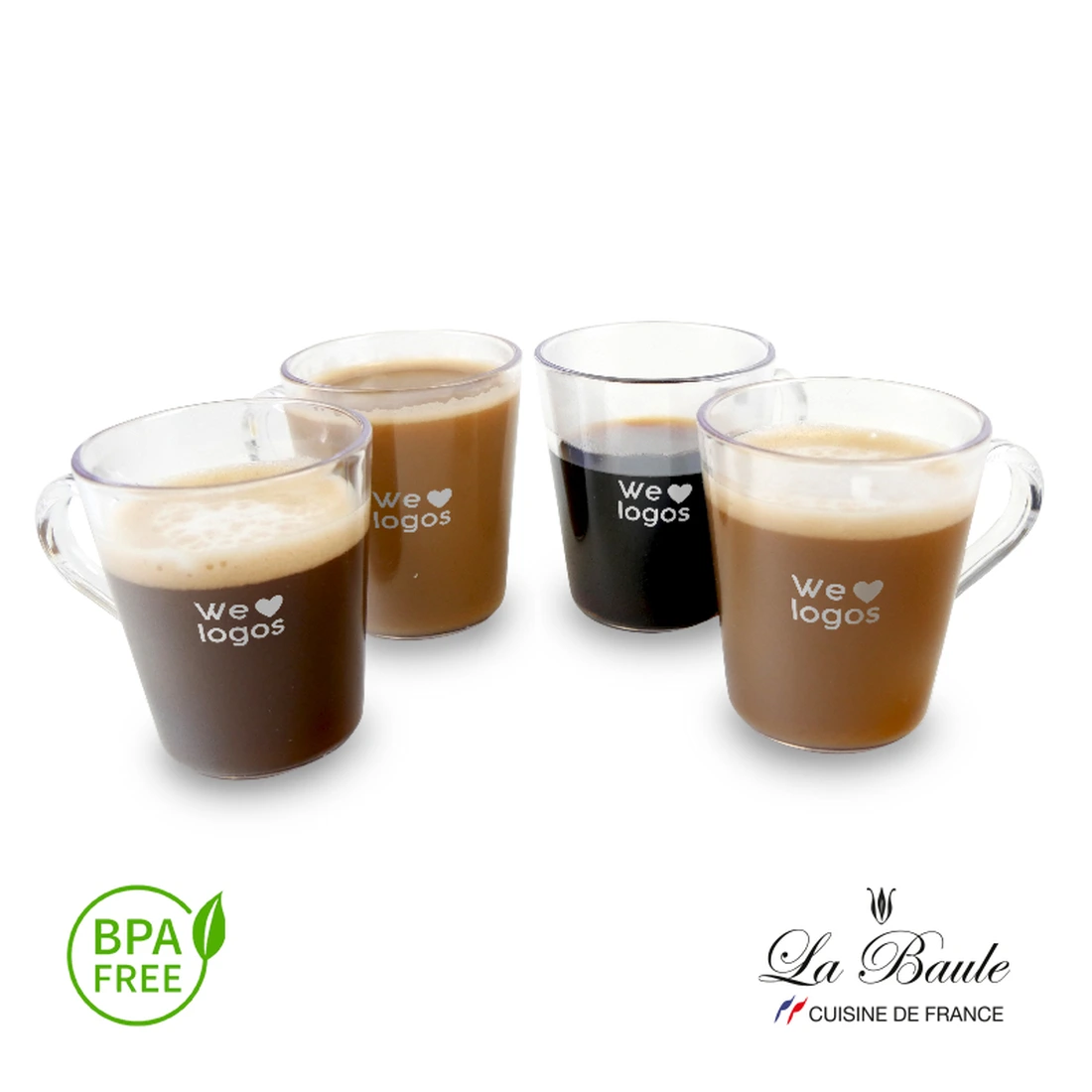 Set de 4 tazas de poliestireno cristal, un material aislante de la temperatura que no transmite el calor de la bebida a la manos. Apto para lavavajillas. Presentado en caja ECO, que puede ser reciclada o compostada. La capacidad de cada taza es de 150 ml. Medidas: 8,5 cm x diámetro 5 cm. Producto libre de BPA. La Baule