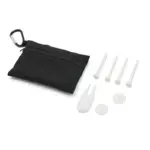 Set de golf con tees, marcadores y arregla piques. Incluye bolsa de poliéster 600D con cierre y soporte, cuatro tees de madera, un reparador de piques y dos marcadores de PS. Todo organizado para facilitar su uso en el campo. Ideal para regalos corporativos y eventos deportivos. TAHG.