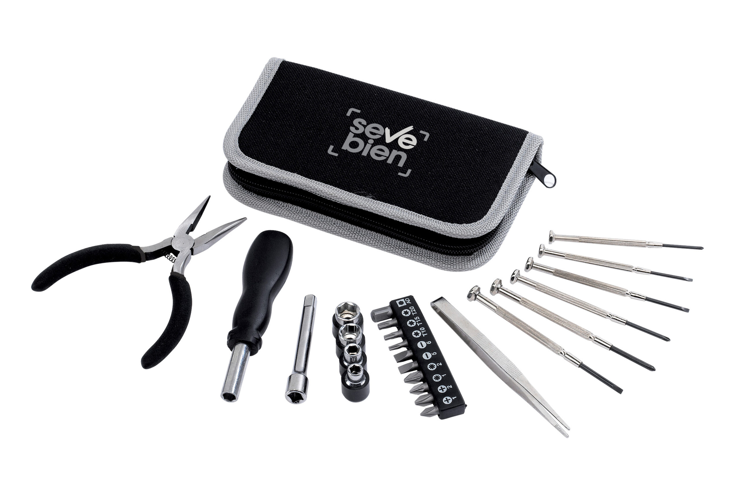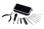 18 x 3,5 x 9,5 cm Set de 24 piezas. Destornilladores, pinzas, complementos. Estuche negro con cierre. Presentación en caja de regalo.
