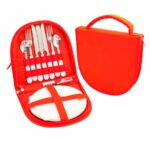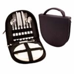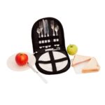 Set de Picnic para 2 personas en bolso raquelado con mango. Incluye set de cubiertos (cuchillos, tenedores y cucharas), 2 platos de melamina blanca, 1 tabla para cortar y 1 herramienta multiuso con destapador, descorchador y cortaplumas.