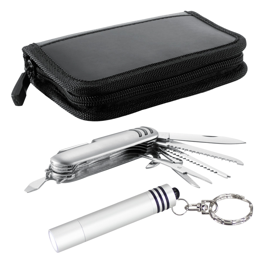Set de Supervivencia «XD», incluye Cortapluma 12 funciones + Llavero-Linterna LED metálica de 9 cm + 3 pilas botón tipo AG3, presentación en elegante Estuche Negro con Gris.