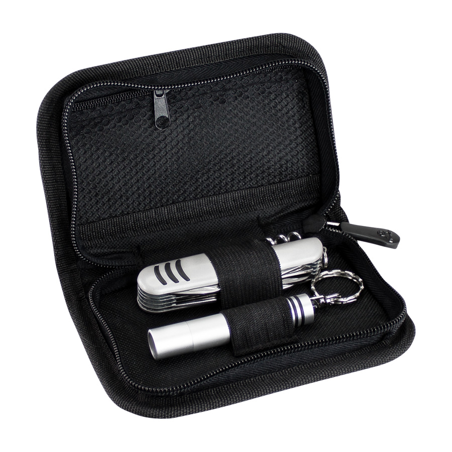 Set de Supervivencia «XD», incluye Cortapluma 12 funciones + Llavero-Linterna LED metálica de 9 cm + 3 pilas botón tipo AG3, presentación en elegante Estuche Negro con Gris.