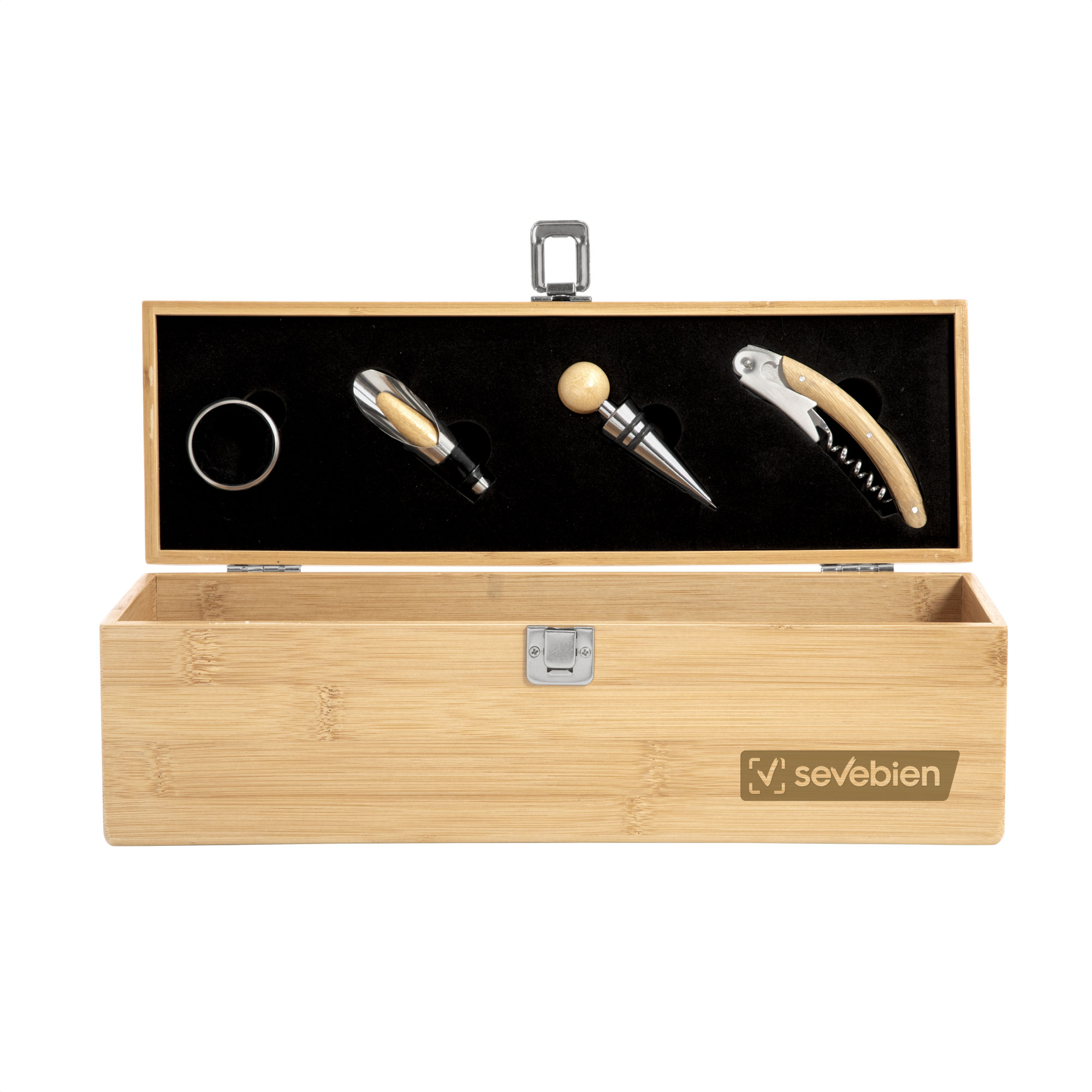 Clásico y completo. El obsequio idealSet de vino. Caja de bambú portabotellas con cierre metálico. Bandeja de eva con set de 4 accesorios: sacacorchos, anillo antigoteo, tapón y vertedor. Medidas: 36 x 11,5 x 11,5 cm.