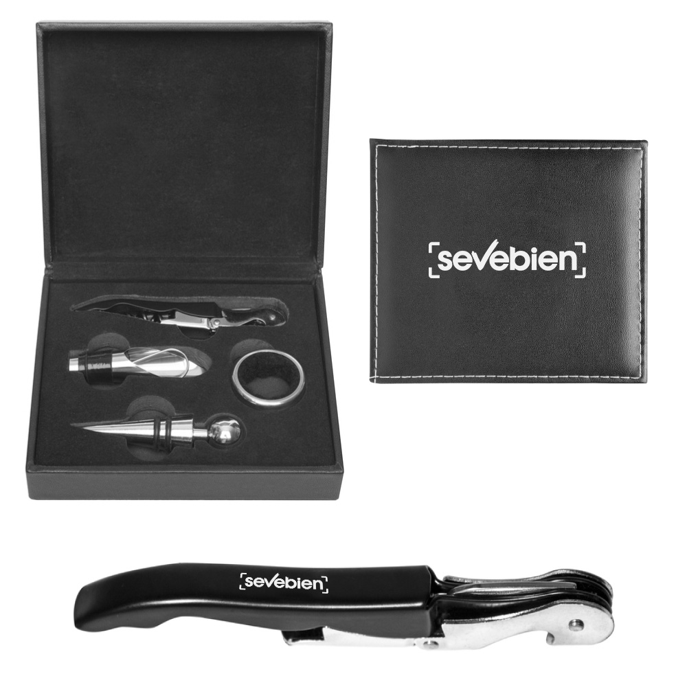 16 x 14 x 5 cm. Simil cuero. Accesorios para vino en estuche de simil cuero. Cuenta con sacacorcho, anillo antigoteo, tapón y corta cápsula. Presentación en caja de regalo.