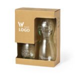Te invitamos a descubrir el Set Hasleg, una propuesta única en la línea de regalos corporativos que destaca por su compromiso con el medio ambiente y su diseño excepcional. Este set incluye una botella de 1 litro y dos vasos de 400 ml, todos fabricados en Europa con vidrio reciclado GRS. El tapón a rosca metálico complementa el diseño, ofreciendo no solo estética sino funcionalidad. El set se presenta en un estuche de cartón reciclado con ventana, haciendo de este conjunto una elección perfecta para quienes buscan regalos corporativos con un mensaje de sostenibilidad.
