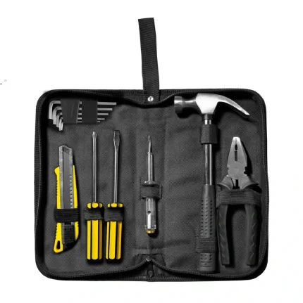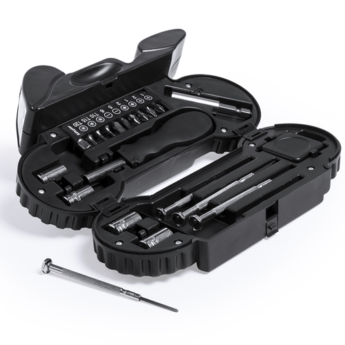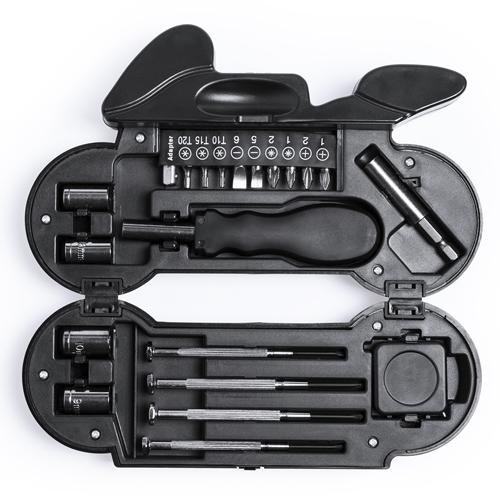 Set de herramientas de 14 accesorios en resistente estuche con diseño de moto, con linterna de 4 ledes integrada. Incluye set de destornilladores de precisión, herramienta de fijación, cabezales destornilladores planos y de estrella y llaves para tuercas de cabeza hexagonal. Pilas de botón incluidas. Presentado en caja individual. 4 Ledes. 21 Accesorios. Pilas Botón Incluidas