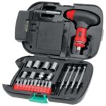 Set de herramientas de 24 accesorios en resistente estuche con linterna led integrada. Incluye set de destornilladores de precisión, herramienta de fijación, cabezales destornilladores planos y de estrella y cabezales de tubo. Alimentación de linterna a pilas: 4xAA no incluidas. Presentado en caja individual. 1 Led. 24 Accesorios. 4 Pilas AA No Incluidas