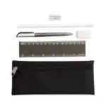 Cartuchera de tela con cierre. Incluye: Lápiz (Tinta azul), Lápiz grafito, regla, goma y sacapuntas. Medidas: 20 x 8.5 x 2 cm.