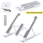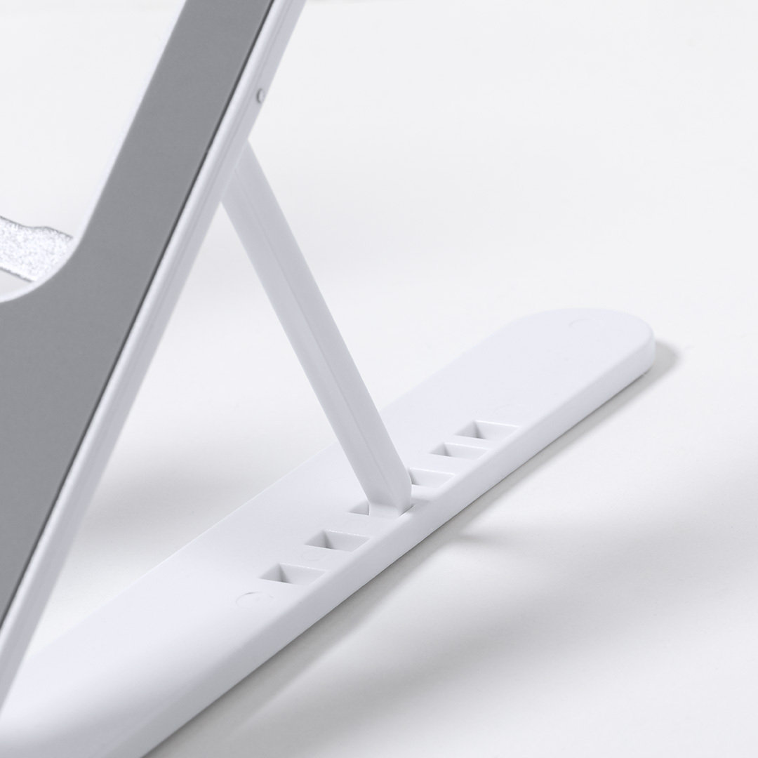 Soporte plegable para portátil. Fabricado en resistente ABS con protecciones antideslizantes en TPR para un firme ajuste al dispositivo. Regulable en altura, con plegado de tamaño compacto y presentado en funda de antelina con cierre de cordón y en caja individual de diseño. Plegable. Altura Regulable. Funda Antelina