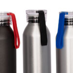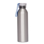 Sport Bottle botella metálica de Aluminio modelo «MARATHON», con tapa rosca de plástico PP translúcido, banda colgante de silicona y anillo interior anti-derrame. Producto BPA FREE, para el contacto con líquidos y alimentos. Capacidad 600ml. Presentación en bolsa plástico burbuja + caja de regalo de cartón lacado color negro. IMPORTANTE: esta botella NO es térmica, apta sólo para líquidos fríos.
