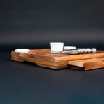 Espectacular tabla de madera sólida de ACACIA, con doble canal para picoteo, gran espacio central para quesos. Contiene 3 posillos de loza blanca para salsas + 6 cuchillos para cortar quesos + 6 tenedores pinchos de queso, de Acero inoxidable , en 2 compartimentos inferiores retráctiles. Madera trabajada y acabada en máquina, de forma 100% regular, con superficies y cantos lisos y suaves, para una mayor higiene y comodidad al momento de cortar y servir los quesos.