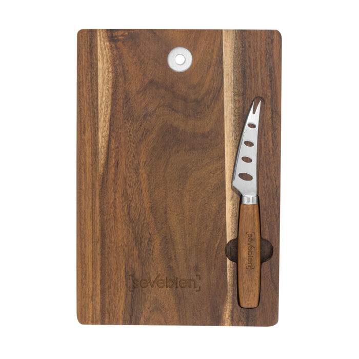 24,5 x 17,2 x 1,5 cm. Madera y acero inoxidable. Tabla para quesos. Tabla de madera de acacia con imán para fijar el cuchillo y anillo de acero inoxidable para colgar. Cuchillo con agujeros ideal para quesos blandos a semiduros, de 17,2 cm., hoja de acero inoxidable 420 y mango de madera de acacia. Presentación en caja de regalo kraft.