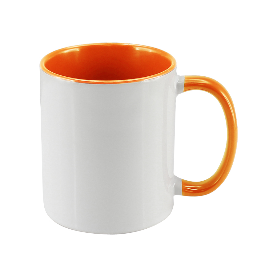 Tazón Cerámico blanco con interior y asa de color, cobertura exterior con polímero especial marca ORCA COATINGS(R) para una sublimación de primera calidad. Cada unidad se entrega dentro de su caja individual de cartón blanco.